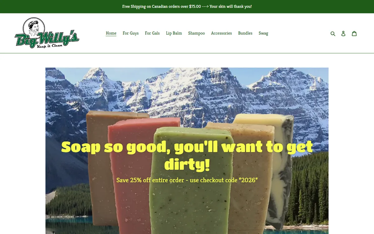 Big Willy's Soap is a Canadian handmade soap and body care brand that brings personality and humour to a product category that often takes itself too seriously. The brand creates handcrafted bar soaps, bath products, and skincare items using natural, skin-friendly ingredients, but wraps them in packaging and branding that's playful, bold, and unapologetically fun. The name itself sets the tone — this is a brand that doesn't shy away from personality.