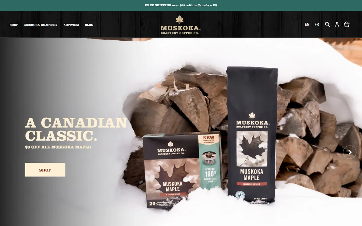 Muskoka Roastery Coffee Co. was founded in 2000 in Huntsville, Ontario, in the heart of the Muskoka cottage country region that draws hundreds of thousands of visitors from Toronto and beyond every summer. The roastery started as a small operation roasting coffee for local cafes and cottagers, and has grown into one of Ontario's best-known specialty coffee brands. The location isn't just a backdrop — the Muskoka identity is woven into the brand's character, packaging, and marketing, making it inseparable from the cottage country experience.