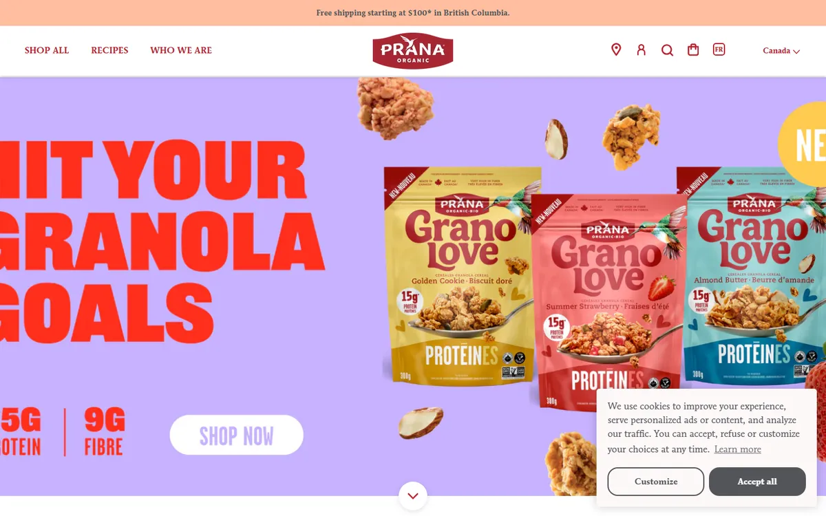 Prana is the number one B Corp in the food category in Canada, certified organic, Fair Trade, non-GMO, kosher, and vegan. The company has committed to becoming a food-waste-free facility and offsets its shipping carbon through partnerships with Grassroots Carbon and Mast Reforestation. Prana calls its approach "snacktivism" — encouraging customers to make informed, sustainable food choices. The brand holds six trademarks in Canada, five in the United States, and two in Europe.