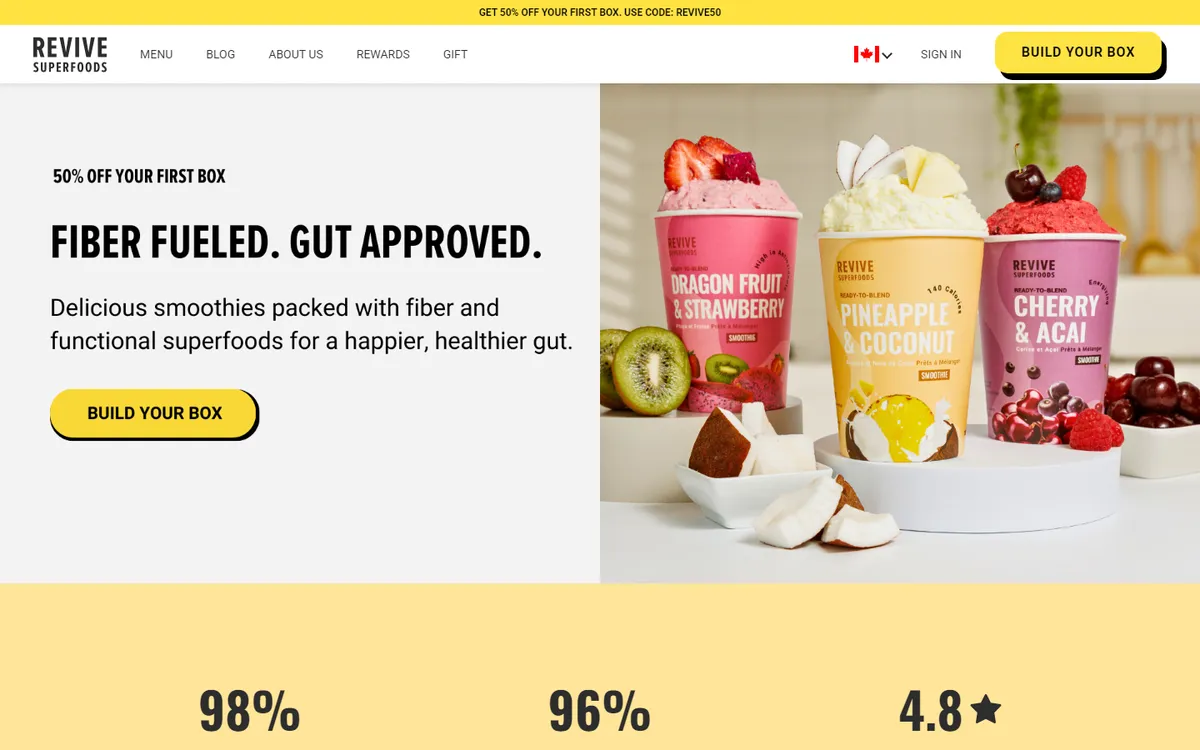 GET 50% OFF YOUR FIRST BOX. USE CODE: REVIVE50 EAT BETTER LIVE BETTER “ I love smoothies but I hated the prep work. I’d get my smoothies from cafes near me but they were always packed with added sugar and unhealthy ingredients that left me feeling bloated and tired.