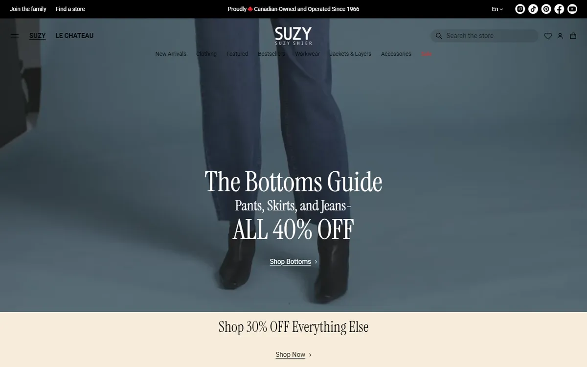 Today, you can shop both brands together online and in select Suzy Shier locations with dedicated Le Château shop-in-shops across Canada. Find a Store Visit one of our locations to explore new arrivals, event dresses, workwear, and accessories.
