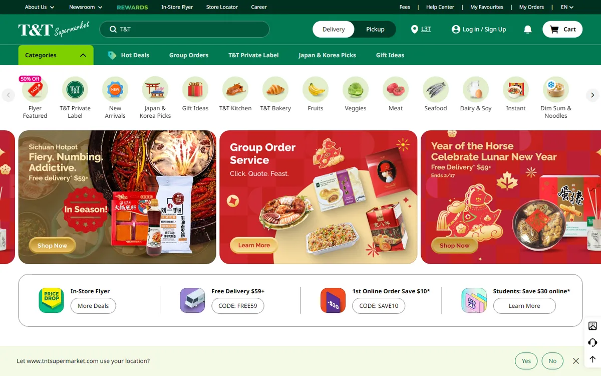T&T stores typically span 35,000 to 80,000 square feet and stock over 20,000 unique items alongside more than 400 private label products. Beyond groceries, the in-store experience includes live seafood tanks, sushi bars, bakeries, BBQ stations, dim sum counters, and Hong Kong-style barbecue. The chain employs 5,300 to 6,000 people and supports its growing customer base through a mobile app with over 10,000 products, multi-language support in English and Chinese, and payment options including WeChat Pay and Alipay.