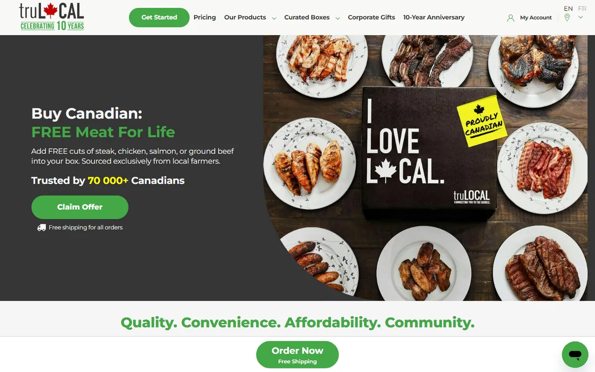 truLOCAL operates as an online marketplace offering over 350 local meat and seafood products — 100% grass-fed beef, air-chilled chicken, wild-caught sockeye salmon, pork, sausages, and specialty items — all antibiotic-free and hormone-free, sourced from small Canadian farms. Products ship frozen in insulated boxes with dry ice. Farm partners include 3Gen Organics for certified organic pork, VG Meats (a family operation since the 1970s), Springhills Fish in Ontario, and Heritage Cattle Co. Each box arrives with a handwritten meat-related pun, and the staff reportedly never repeats a joke.