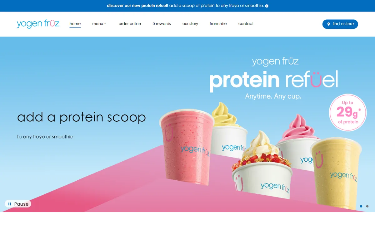 A concept was developed that consumers immediately loved, and a strong following pursued. The name Yogen implies yogurt, of course, and Früz calls forth “frozen”, “fruit” and “fresh”, all of which play a part in the Yogen Früz concept.